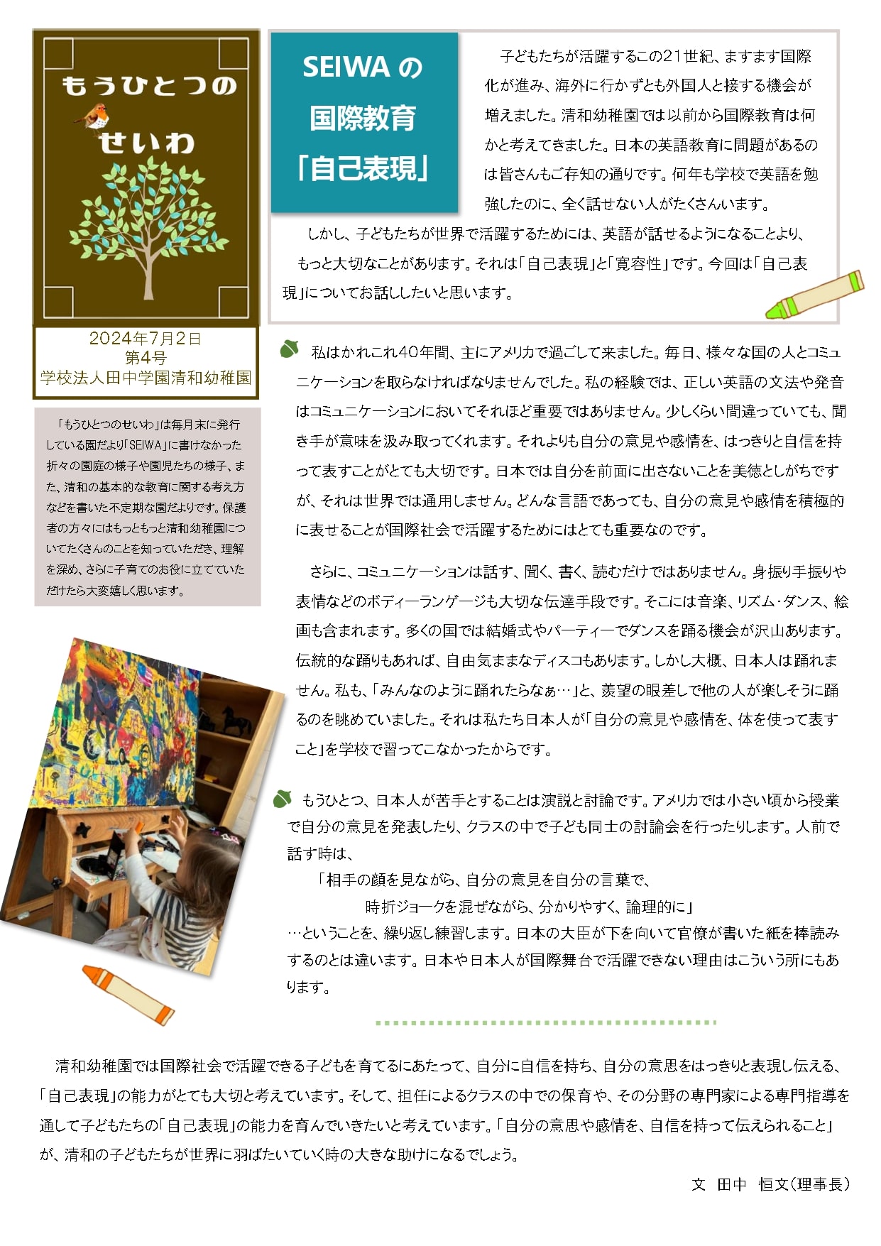 「もうひとつのせいわ」は毎月末に発行している「SEIWA」に書けなかった折々の園庭の様子や園児たちの様子、また、清和の基本的な教育に関する考え方などを書いた不定期な園だよりです。保護者の方々にはもっともっと清和幼稚園についてたくさんのことを知っていただき、理解を深め、さらに子育てのお役に立てていただけたら大変嬉しく思います。